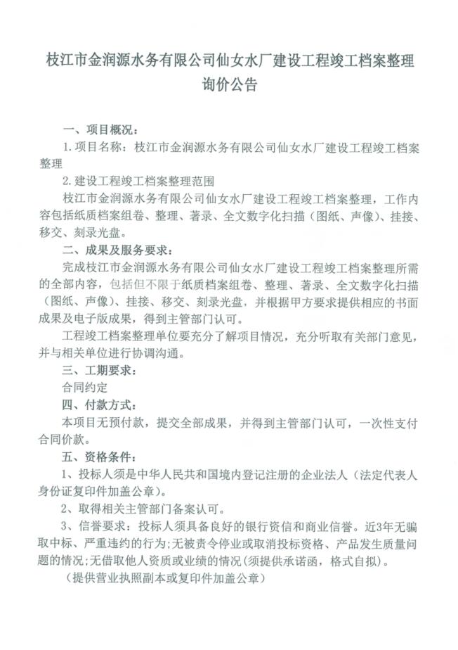 仙女水廠(chǎng)建設工程竣工檔案整理詢(xún)價(jià)公告