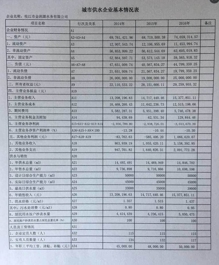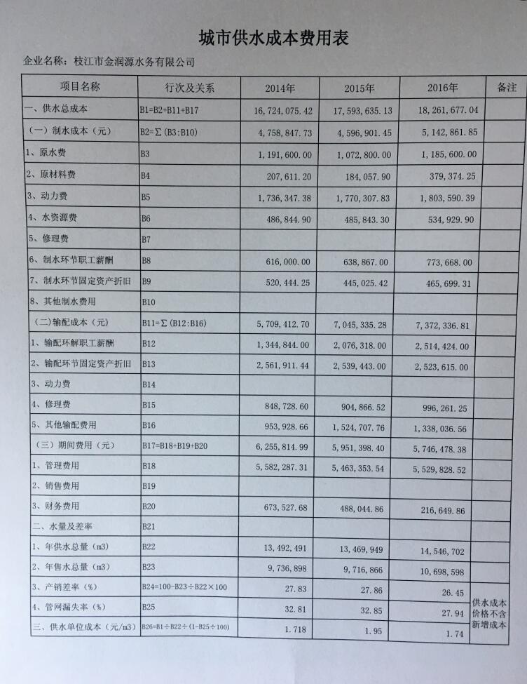 目前自來(lái)水價(jià)格執行的是2012年10月1日經(jīng)枝江市物價(jià)局枝價(jià)發(fā)[2012]25號文件批準的價(jià)格,銷(xiāo)售均價(jià)為1.438元/立方米。2012年的調價(jià),主要是針對引魯入城項目建設,調價(jià)后的收益用于項目還貸。四年來(lái),隨著(zhù)枝江市經(jīng)濟社會(huì )高速發(fā)展及城市基礎設施建設的加快推進(jìn),水務(wù)公司為配合城市配套建設,籌集了大量資金用于市政配套管網(wǎng)建設,由于投入不斷擴大、成本費用增加、機物料價(jià)格上漲等多方因素的影響,形成了供水價(jià)格與供水成本倒掛。截止目前自來(lái)水成本達1.74元/立方米,加上新增投資仙女水廠(chǎng)成本0.50元/立方米,總成本達2.24元/立方米,因此需調整自來(lái)水價(jià)格來(lái)維持企業(yè)正常經(jīng)營(yíng)。