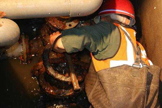 為降低維修對廣大用戶(hù)用水的影響,水務(wù)公司安排在深夜開(kāi)展閥門(mén)更換工作。9月19日晚22:00水務(wù)公司組織12名工作人員分成3個(gè)小組,經(jīng)過(guò)6個(gè)小時(shí)奮戰,于次日凌晨4:00順利完成了沿江大道、禮化路等路段共3臺主管網(wǎng)閥門(mén)的更換任務(wù)。從9月20日開(kāi)始,水務(wù)公司組織了近20名工作人員開(kāi)始清洗反應池、沉淀池,清洗的同時(shí)對池內損壞的格柵進(jìn)行了更換,經(jīng)過(guò)兩天緊張有序的工作,圓滿(mǎn)完成了水廠(chǎng)東、西反應池、沉淀池的清洗任務(wù)。