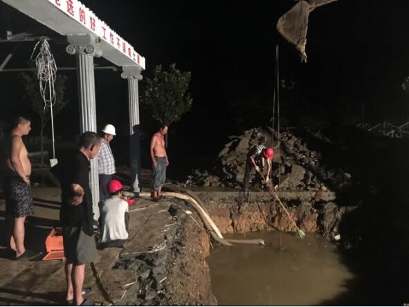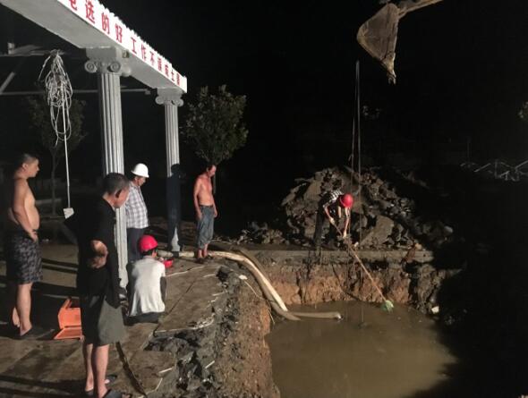 險情就是命令。接到電話(huà)后,水務(wù)公司立即啟動(dòng)應急搶險機制,第一時(shí)間在電視臺發(fā)布啟用長(cháng)江備用水源緊急公告,并按照預先制定的應急預案,組織人員、機械、設備、物資奔赴現場(chǎng)。經(jīng)過(guò)現場(chǎng)勘察,迅速確定了應急搶修方案。因爆裂的源水管位于一家石材加工廠(chǎng)的兩座臨時(shí)建筑物下,且屋頂設置有太陽(yáng)能光伏發(fā)電板等設備,現場(chǎng)情況復雜,又加上源水管道埋深達5米,管網(wǎng)長(cháng)、管徑粗、漏水量大,搶修工作異常艱難。經(jīng)過(guò)緊急協(xié)商,石材廠(chǎng)老板同意調集挖掘機、吊車(chē)對兩座構筑物及相關(guān)發(fā)電設備進(jìn)行了拆除,并按商定的搶修方案進(jìn)行排水、破除、開(kāi)挖。水務(wù)公司主要負責人親自到搶修現場(chǎng)指揮和安排搶修工作,整個(gè)搶修工作都在緊張有序中展開(kāi)。面對現場(chǎng)搶修環(huán)境惡劣,高溫炙熱,蚊蟲(chóng)飛舞,餓了就地吃盒飯,困了就地打個(gè)盹起來(lái)再干,衣服濕了又干,干了又濕。我們的搶修隊員沒(méi)有絲毫的怨言和懈怠,大家心里只有一個(gè)目的就是盡快恢復供水。