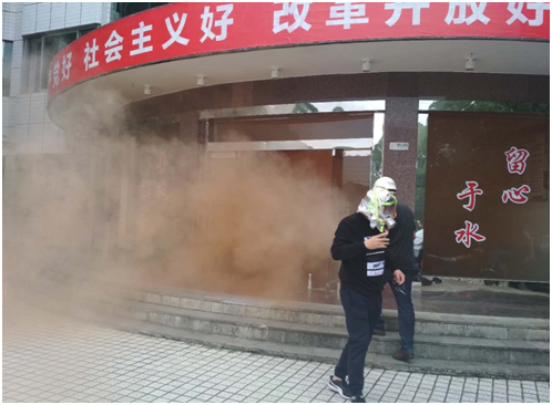 為加強實(shí)踐,培訓結束后,全體人員來(lái)到辦公樓,進(jìn)行了逃生及滅火實(shí)戰演練。按照預先設定的事故場(chǎng)景、時(shí)間,辦公樓煙霧撲鼻,所有樓層員工在消防教員的指揮下,戴上防護面罩,用濕毛巾捂住口鼻,緊而有序地沿著(zhù)樓梯撤離到廣場(chǎng)上“逃生”。消防演練中,教官手把手教大家手持干粉滅火器,對準火源根部由遠及近進(jìn)行掃射,直至火源撲滅。大大提高了員工撲救初期火災的能力。