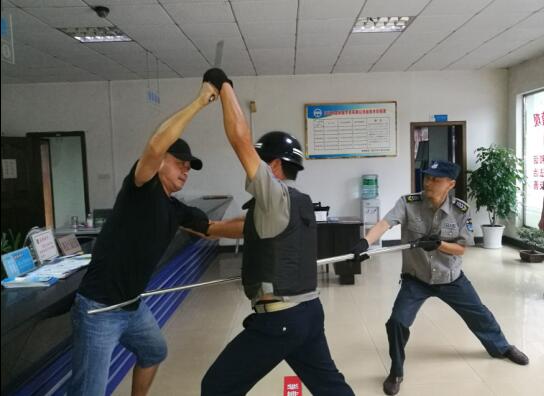 15:30分,演練準時(shí)開(kāi)始。兩名由公司員工扮演的“可疑人員”偷偷潛入收費大廳,觀(guān)看四周后突然拿出兇器威逼收費人員交出現金,收費人員沉著(zhù)鎮定,快速反應,設法穩住歹徒,并尋機避開(kāi)歹徒視線(xiàn),迅速下蹲后高聲呼叫并及時(shí)報警,大廳保安迅速與公司保安取得聯(lián)系,隨即拿出橡膠警棍、防暴鋼叉、木棒等將歹徒制服。