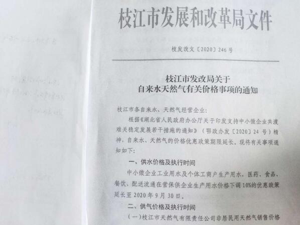 根據《市人民政府辦公室關(guān)于印發(fā)宜昌市支持餐飲行業(yè)紓困發(fā)展若干措施的通知》(宜府辦發(fā)〔2020〕15號)《枝江市人民政府關(guān)于支持企業(yè)應對疫情共渡難關(guān)的政策措施》(枝府發(fā)〔2020〕1號)文件精神,2020年2月1日至6月30日期間對中小微企業(yè)批發(fā)業(yè)、零售業(yè)、餐飲業(yè)、住宿業(yè)的非居民用水客戶(hù),其用水價(jià)格按現行政策的90%結算。后期執行《湖北省人民政府辦公廳關(guān)于印發(fā)支持中小微企業(yè)共渡難關(guān)穩定發(fā)展若干措施的通知》(鄂政辦發(fā)〔2020〕24號)《枝江市發(fā)改局關(guān)于自來(lái)水天然氣有關(guān)價(jià)格事項的通知》(枝發(fā)改文〔2020〕246號)文件要求,對中小微企業(yè)工業(yè)用水及個(gè)體工商戶(hù)生產(chǎn)用水,醫藥、食品、餐飲、配送流通在營(yíng)保供企業(yè)生產(chǎn)用水價(jià)格下調10%的優(yōu)惠政策期限延長(cháng)至2020年9月30日。