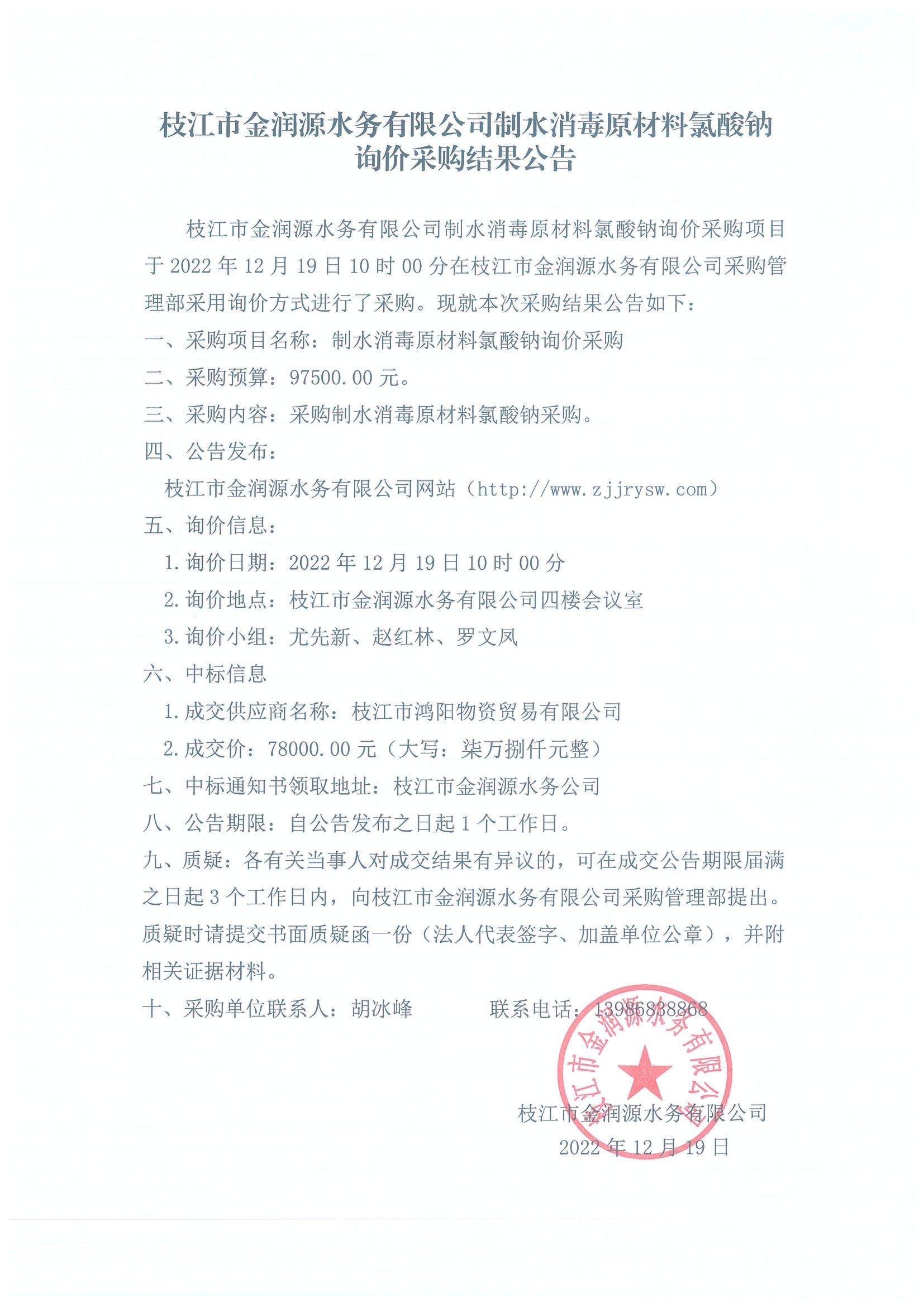 水務(wù)公司制水消毒原材料氯酸鈉詢(xún)價(jià)采購結果公告