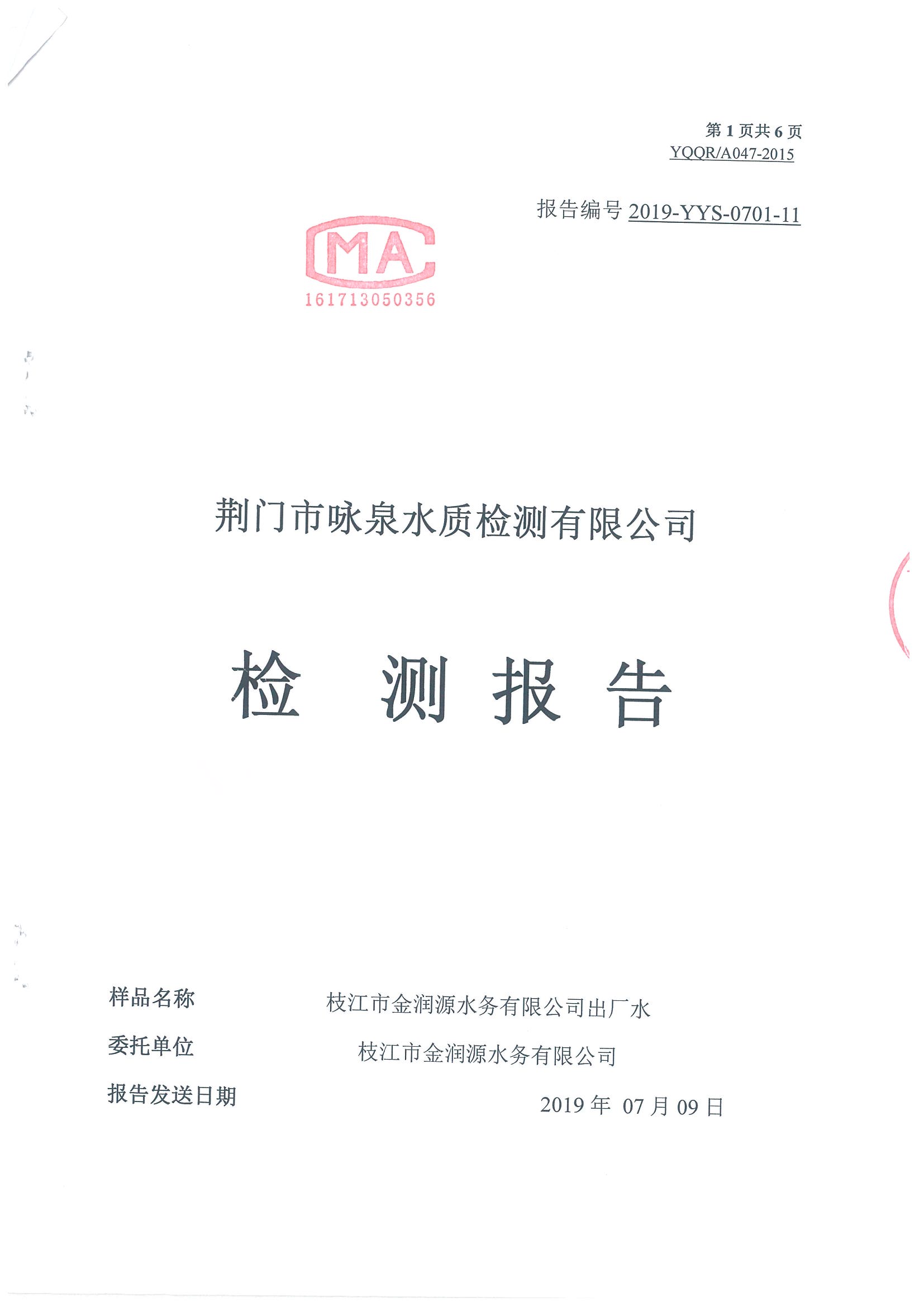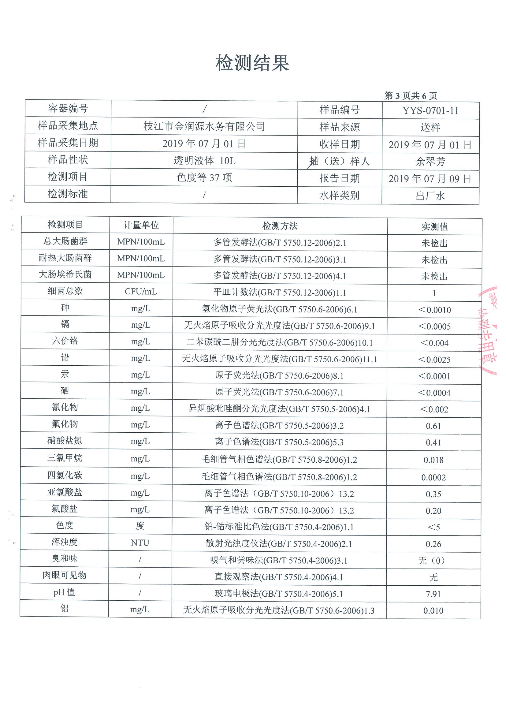 2019年7月水質(zhì)檢測報告
