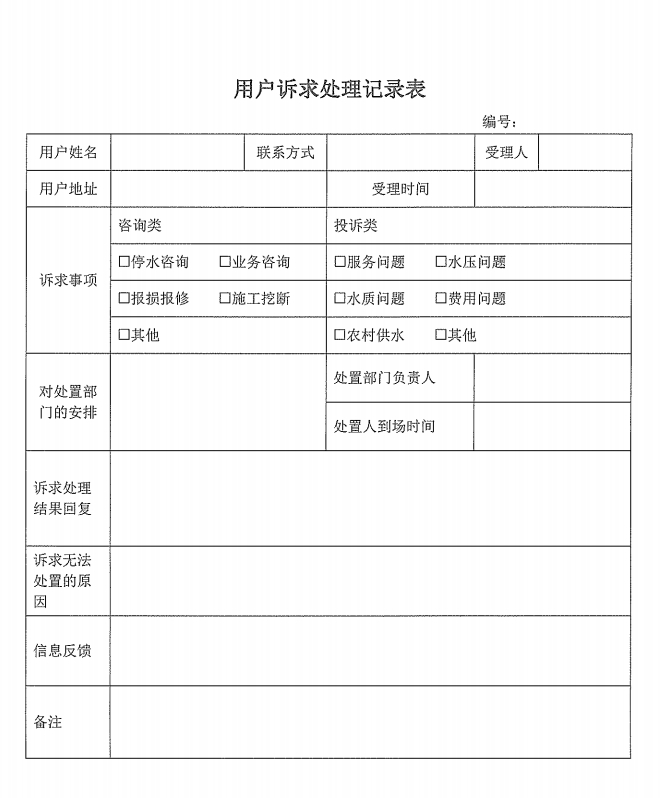 五、《用戶(hù)投訴處理記錄表》由仙女水廠(chǎng)按規定統一存檔備案。