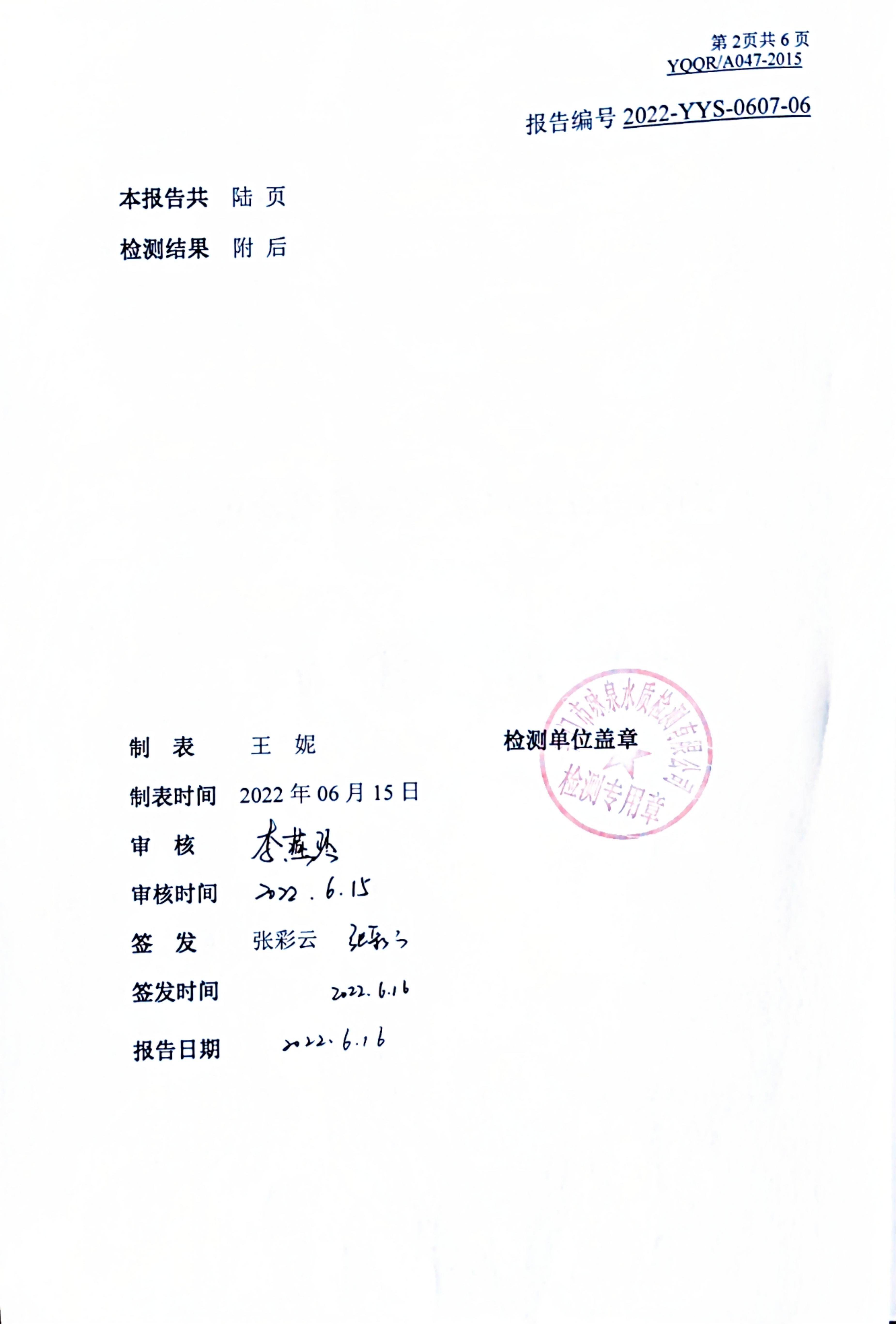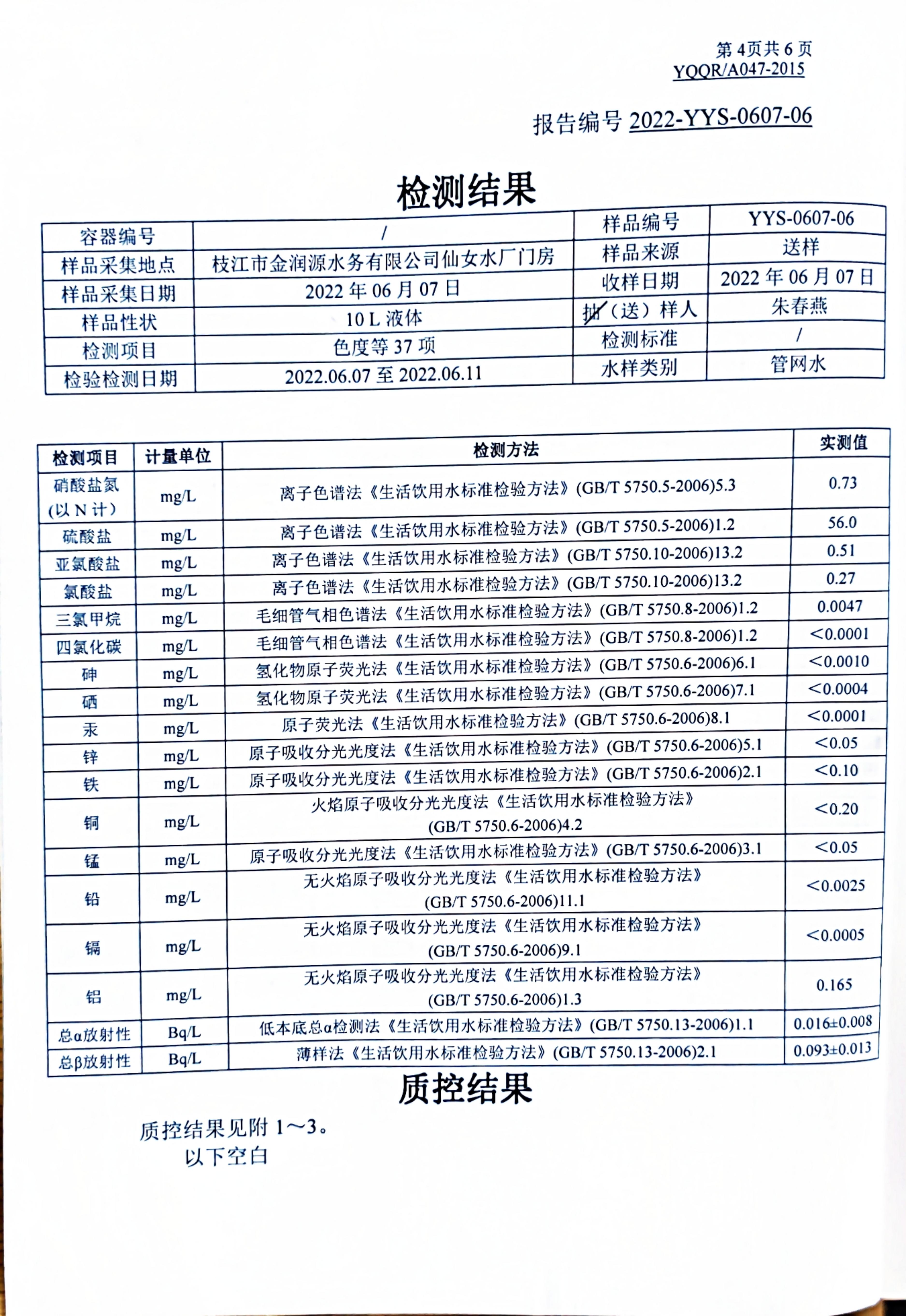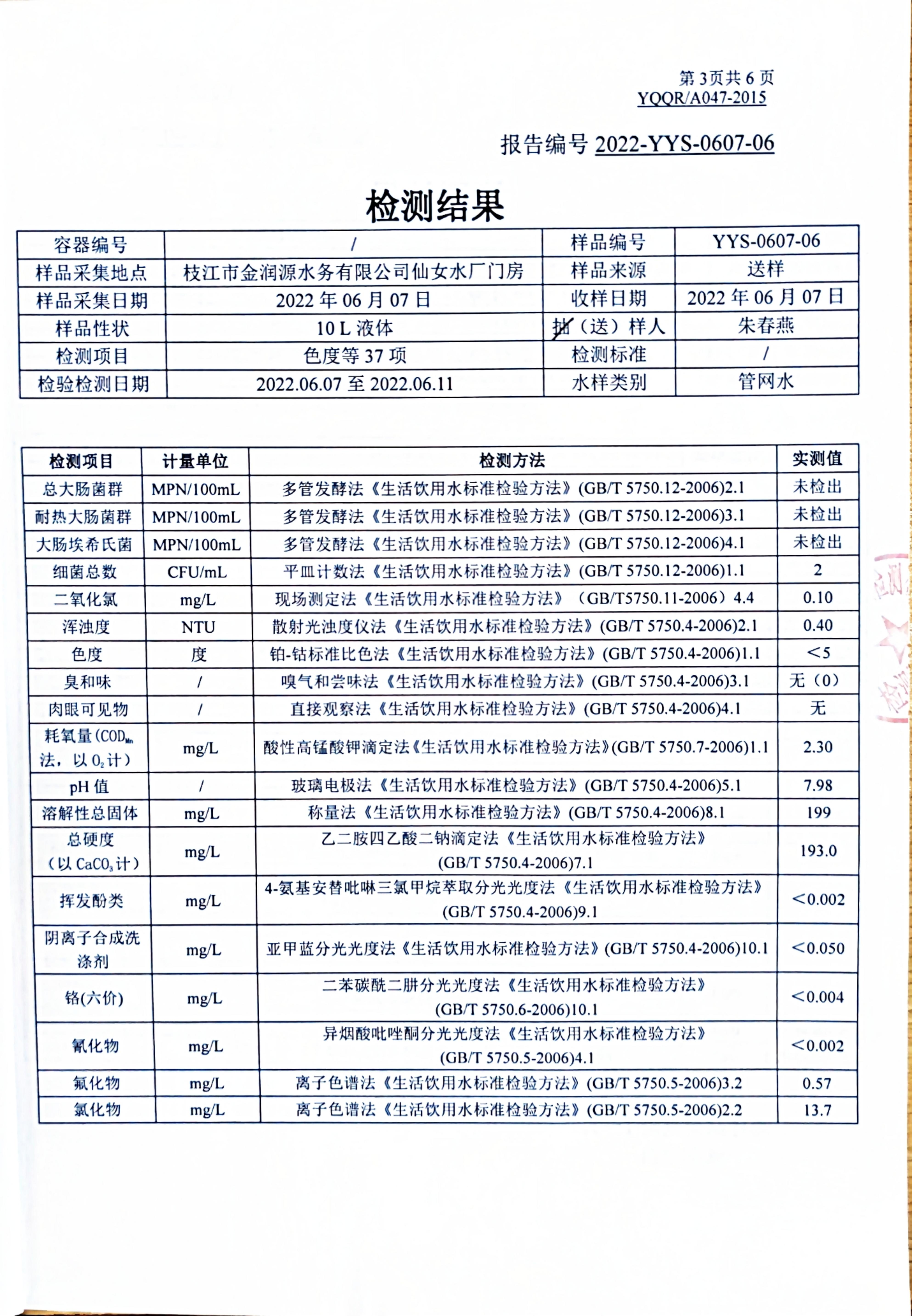 2022年6月管網(wǎng)水水質(zhì)公告