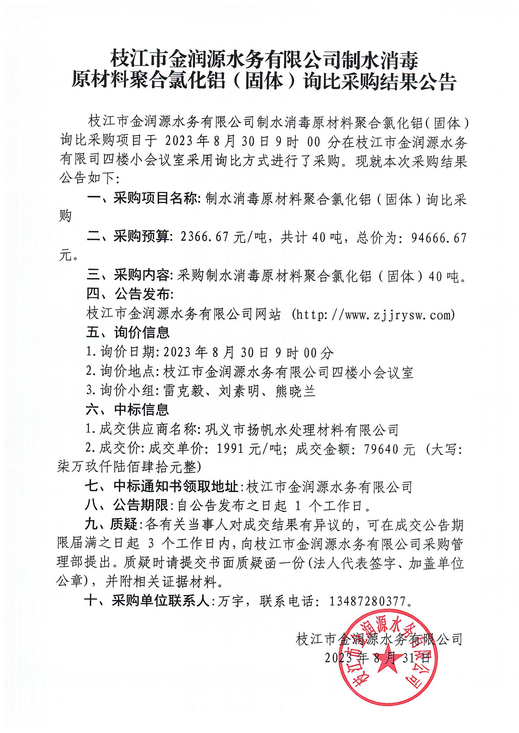 詢(xún)價(jià)結果公告-聚合氯化鋁