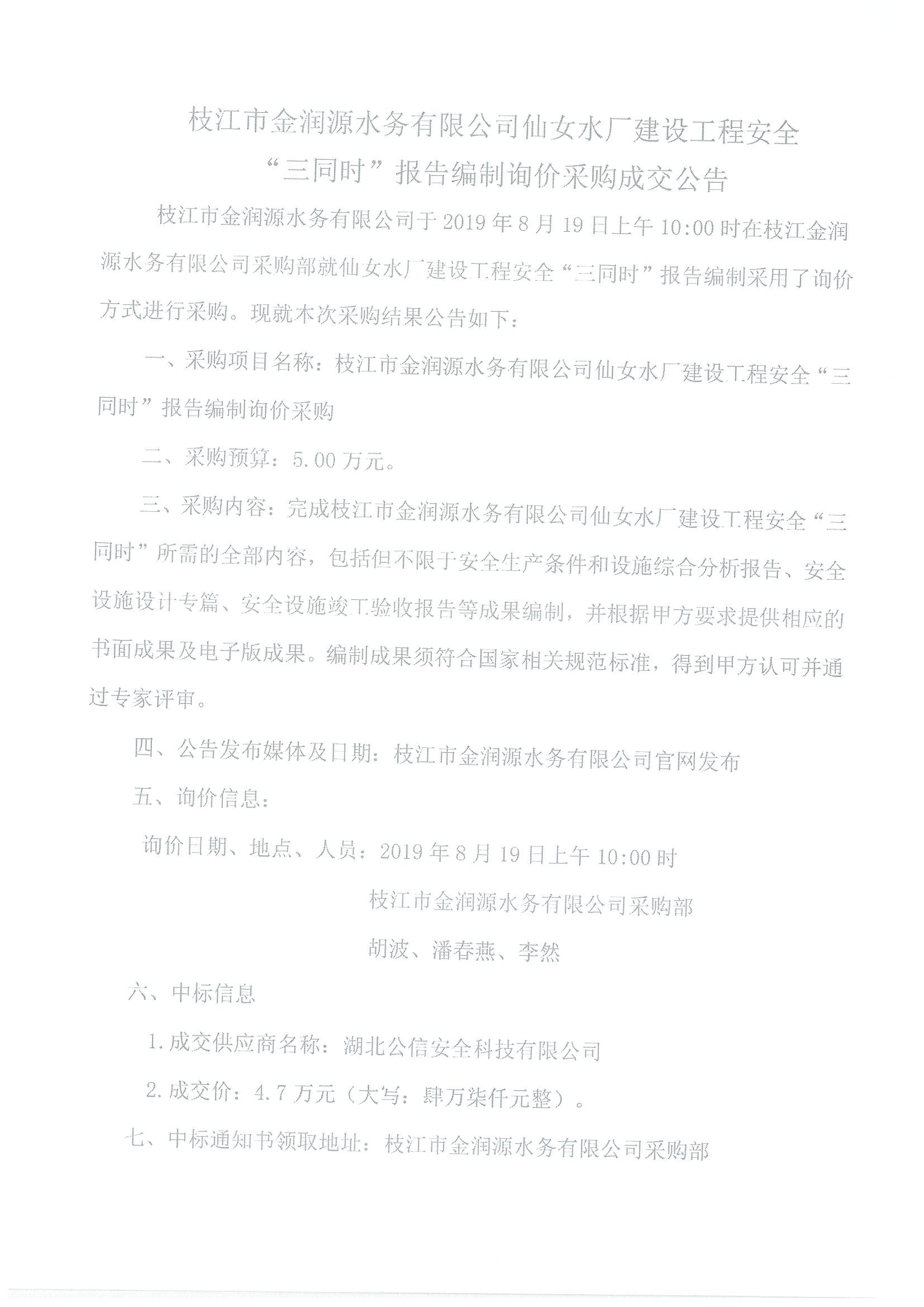 枝江市金潤源水務(wù)有限公司仙女水廠(chǎng)建設工程安全“三同時(shí)”報告編制詢(xún)價(jià)采購成交公告