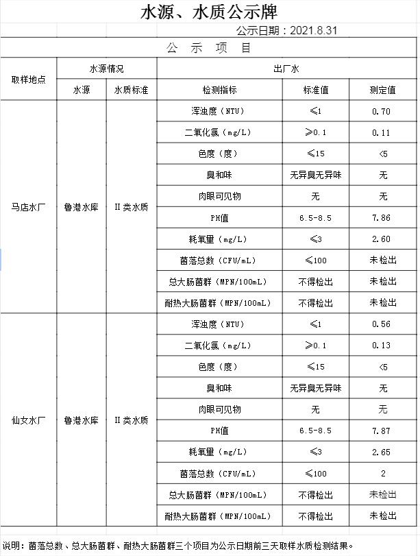 2021年8月31日水質(zhì)公告