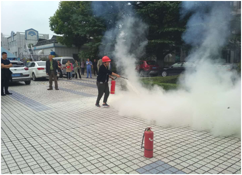 為加強實(shí)踐,培訓結束后,全體人員來(lái)到辦公樓,進(jìn)行了逃生及滅火實(shí)戰演練。按照預先設定的事故場(chǎng)景、時(shí)間,辦公樓煙霧撲鼻,所有樓層員工在消防教員的指揮下,戴上防護面罩,用濕毛巾捂住口鼻,緊而有序地沿著(zhù)樓梯撤離到廣場(chǎng)上“逃生”。消防演練中,教官手把手教大家手持干粉滅火器,對準火源根部由遠及近進(jìn)行掃射,直至火源撲滅。大大提高了員工撲救初期火災的能力。