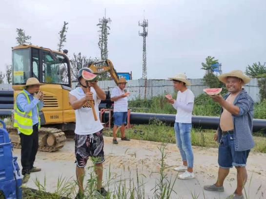 慰問(wèn)組一行先后來(lái)到姚家港城區聯(lián)網(wǎng)工程項目施工現場(chǎng)及供水營(yíng)銷(xiāo)部、仙女水廠(chǎng),為施工工人及抄表工送去精心選配的藿香正氣水、人丹、西瓜、風(fēng)油精、毛巾等清涼消暑品。對所有不畏高溫酷暑仍然堅守在一線(xiàn)的工人們表達了衷心的感謝,肯定了大家的辛苦付出,并叮囑現場(chǎng)人員在加強施工安全和質(zhì)量的同時(shí),要注意防暑降溫,增強安全防范意識,做好日常疫情防護,合理安排作息時(shí)間,確保身體健康。